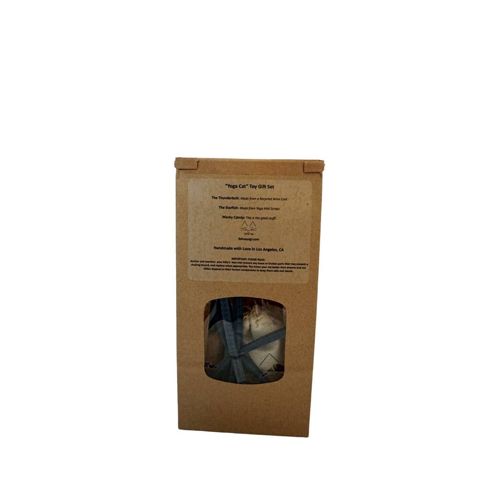 Feline Yogi uses our extra yoga mat scraps left over from the yoga cat mats to make a fun "kitty yoga prop" star shaped and wine cork toy that kitties will love to bat around. A cute little muslin bag with catnip is sure to please!