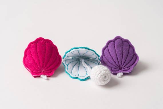 Cats will be wrestling this oyster to pop the pearl out because not only are the seashells infused with catnip, the pearl has a bell in it to stir those kitties into a frenzy. The pearl is tightly crocheted around a hollow wooden ball and is securely attached to the seashells. Comes in three different colors: teal, pink, and purple. Packaged on hanging tags with barcode on back.