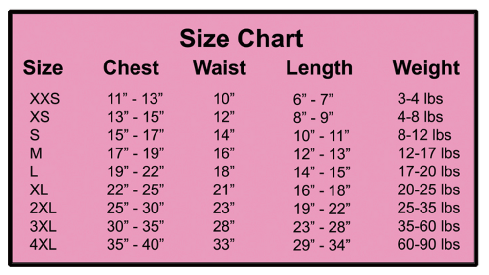 Please use the waist measurement when ordering Dog In The Closet skirts. The skirts need to fit tight so DO NOT go up a size when ordering our skirts. Skirts all have Velcro closures and will adjust larger than the size on the chart but will not adjust smaller. For example, if your dog measures 14” in the waist (Size S) but you think she will need it to fit at 13.5” to keep it from slipping, please order the Size XS. Call, text or email us for help with the size. Please include all measurements in the Notes at Checkout.