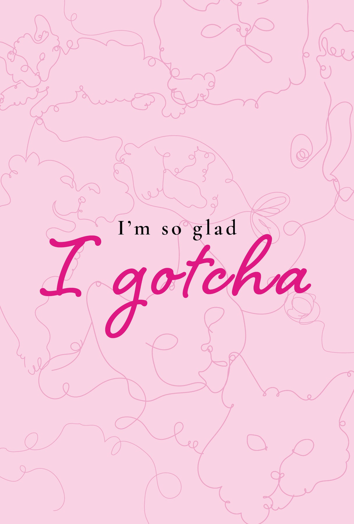 Greeting card with a light pink background and the text 'I'm so glad I gotcha' in bold pink letters, surrounded by a pattern of cat lines.