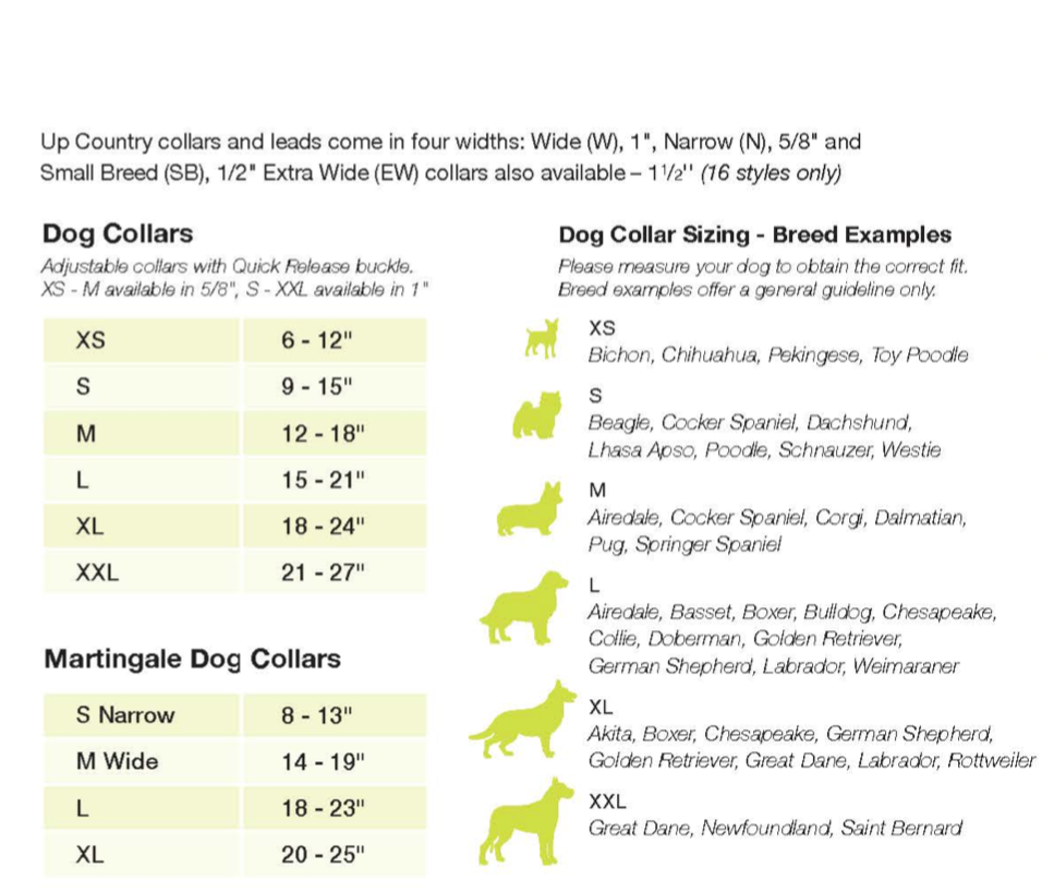 Up Country's ribbon collars, leads and harnesses come in a wide variety of lengths, and in three widths.