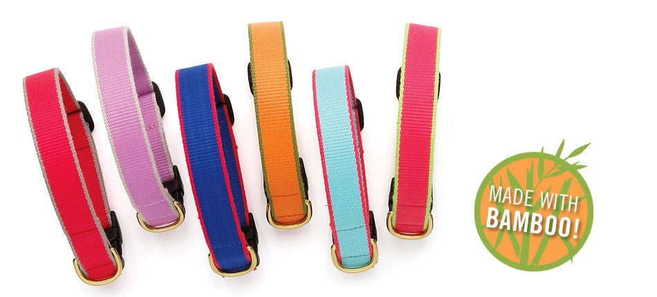 Ribbon collars are made from high-tensile strength nylon webbing with sewn on polyester/nylon ribbons. Our ribbons are stain and fray resistant; designed to last a lifetime. All collar and lead hardware is cast, not welded brass for extra strength. Our buckles are Coast Guard approved for high weight hold. Machine wash cold, air dry.