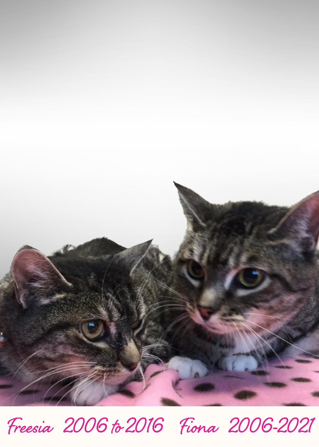 I rescued Fiona & Freesia from a junk-filled garage. They were 9 months old and unsocialized. It took years to gain their trust. Freesia crossed the bridge early in life with cancer. 2006-2016 They were inseparable, but Fiona warmed up to us. Fiona also had cancer, and in the last days with Chloe, Fiona stopped eating, and Lily had a stroke. All three girls crossed the bridge together. 2006-08/27/21